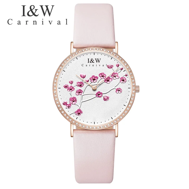 Kopen Goedkoop 2018 CARNAVAL Horloge Vrouwen Mode Steentjes Jurk Roze Lederen Dameshorloge Luxe Prachtige vrouwen Horloges relogio feminino Online