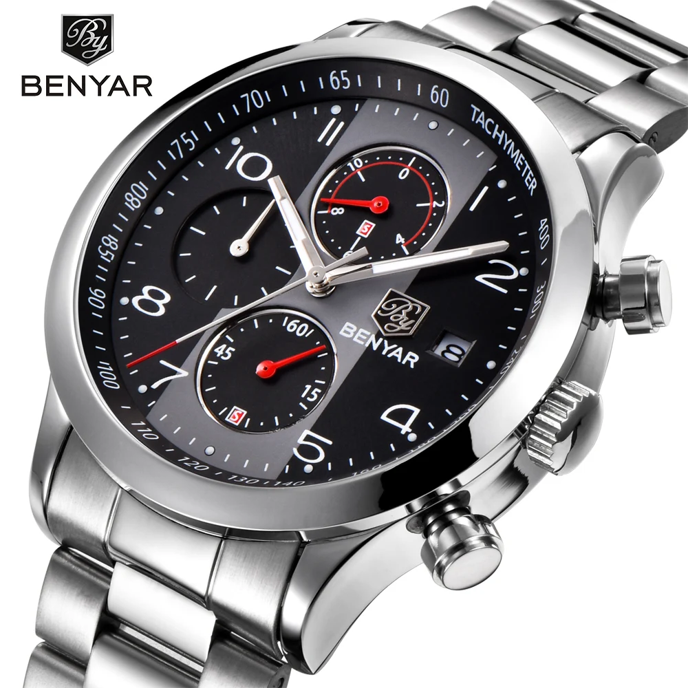 Goede Koop BENYAR Mode Chronograaf Sport Horloges Mannen Roestvrij Stalen Band Merk Quartz Horloge Klok Relogio Masculino Reloj Hombre zwart Goedkoop