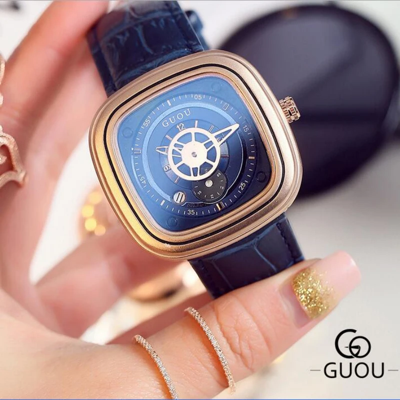 Goede Kopen GUOU Fashion Casual Horloge Vrouwen Horloges Vierkante Wijzerplaat Rose Goud Dameshorloge Horloges Auto Datum Klok saat reloj mujer Goedkoop