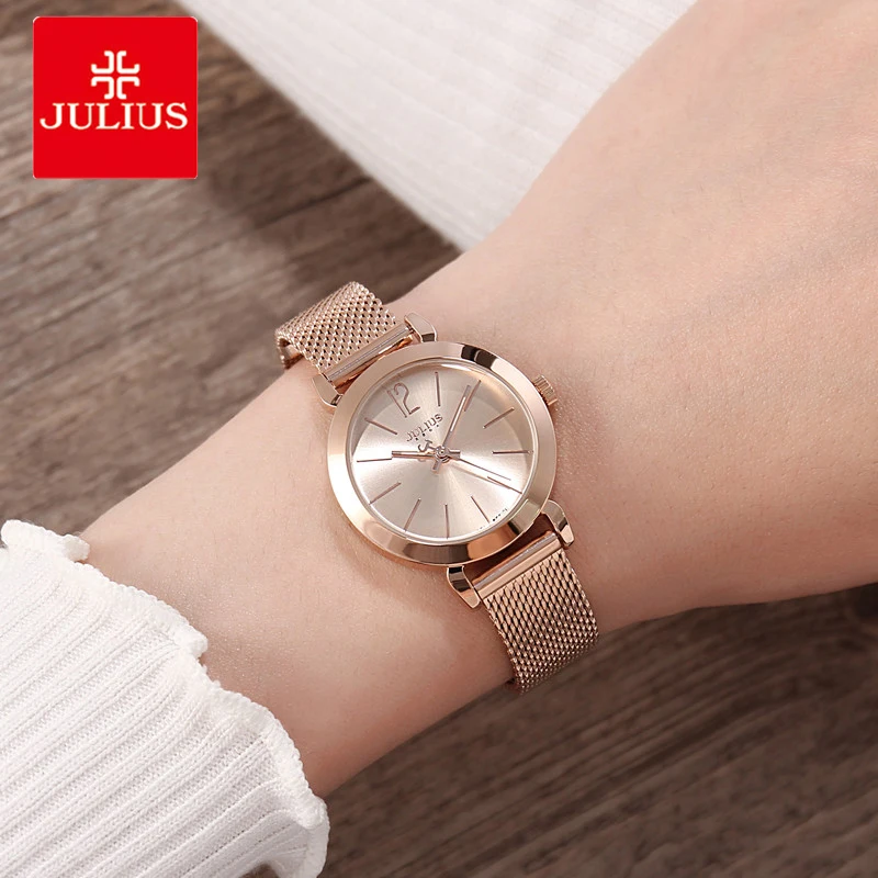 Kopen Goedkoop Julius Vrouwen Horloges Zilver Rose Gold Tone Mesh Rvs Quartz Analoog Waterdicht Horloge Casual Vrouwelijke Klok Montre Femme Prijs