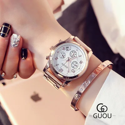 Kopen Goedkoop GUOU Horloge Vrouwen Luxe Volledige rvs Gold Horloges Classic Drie ogen Quartz Dames Horloges Fashion waterdicht Horloge Online