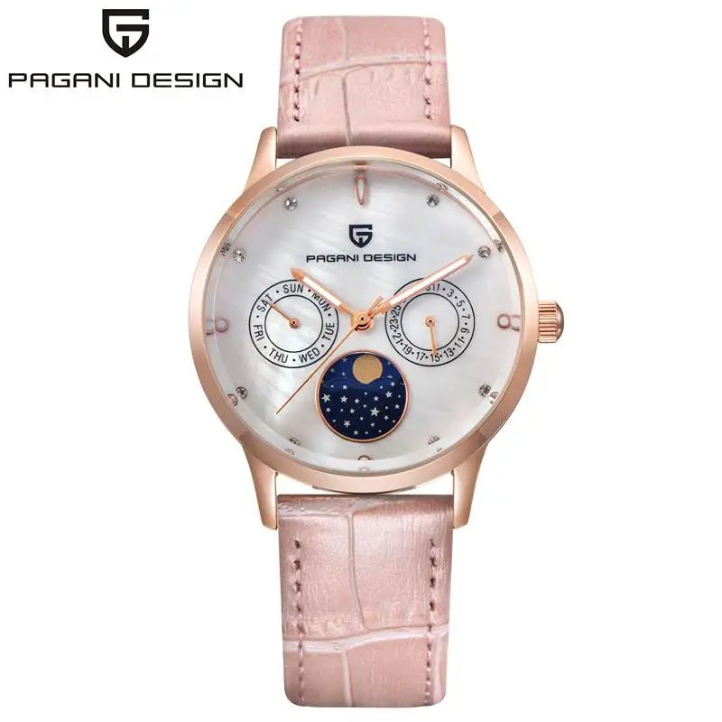 Kopen Goedkoop PAGANI ONTWERP Roze Lederen Vrouwen Horloge Fashion Casual Lady Meisje Japanse Quartz Auto Datum Maanfase Horloges PD 2723L Prijs