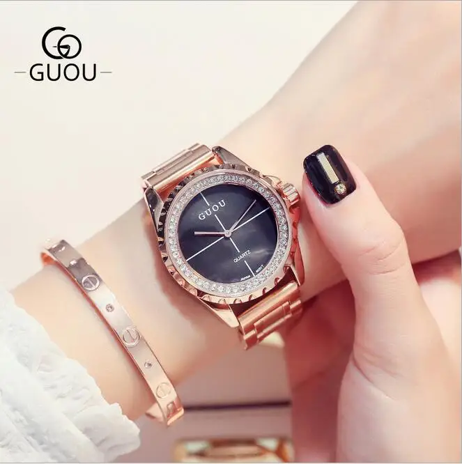 Kopen Goedkoop GUOU Nieuwe Vrouwen Horloges Mode Eenvoudige Stalen Horloges Luxe Exquisite Diamant Dames Horloges saat relogio feminino klok Prijs