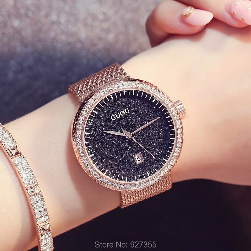 Kopen Goedkoop Nieuwe 2018 GUOU Jurk Vrouwen Horloges Stijlvolle Sky Bule Crystal Rhinestones Quartz Horloge Lady Armband Relogio Casual Horloge Prijs