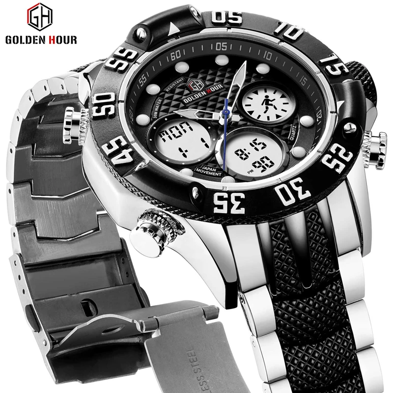 Kopen Goedkoop GOLDENHOUR Mens Sport Analoge Digitale Horloges Outdoor Waterdichte Grote Case Militaire Polshorloge Volledige Roestvrij Quartz Mannelijke Klok Prijs