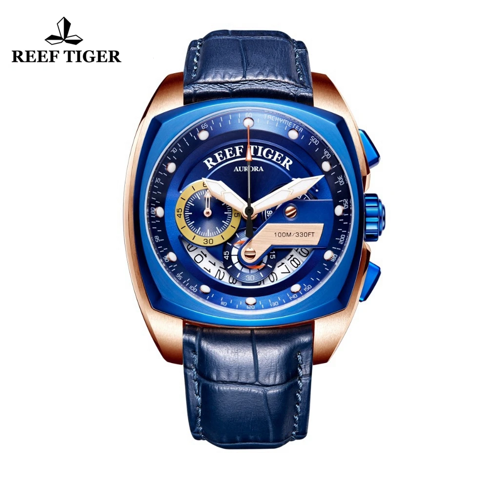 Goede Koop 2018 Reef Tijger RT Top Merk Sport Horloge voor Mannen Luxe Blauw Horloges Lederen Band Waterdicht Horloge Relogio Masculino RGA3363 Goedkoop