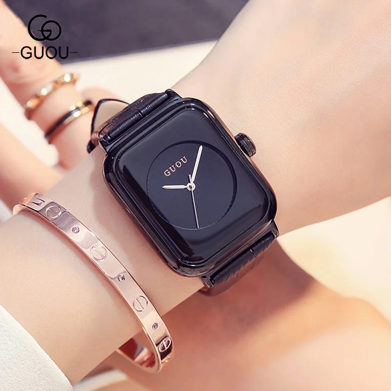 Beste Koop 2018 Fashion GUOU Eenvoudige Rechthoek Hardlex Gezicht Lederen Quartz Horloges Horloge Armband voor Vrouwen Dames Vrouwelijke Goedkoop