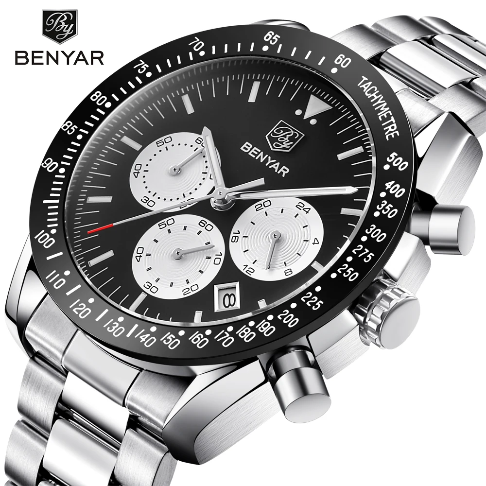 Goede Kopen BENYAR Merk Mannen Sport Chronograaf Horloges Alle pointers werk Waterdichte Mode Staal Roestvrij Quartz Horloge dropshipping zwart Goedkoop