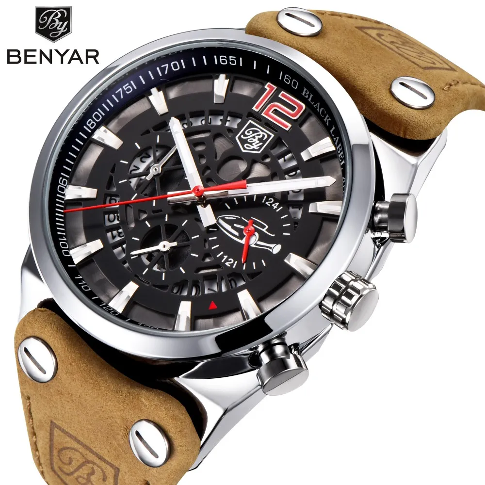Beste Kopen BENYAR Chronograaf Sport Heren Horloges Modemerk Militaire Waterdichte Lederen band Quartz Horloge Klok Relogio Masculino Goedkoop