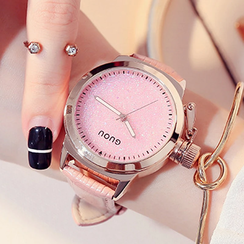 Beste Koop Vrouwen Horloges GUOU Dameshorloge Luxe Fonkelende Diamant Horloge Lederen Band Klok vrouwen Horloges bayan saat Goedkoop