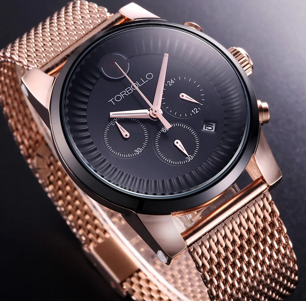 Beste Kopen 2016 Luxe Mesh Bandjes Mens Polshorloge Quartz Chronograph Multifunctionele Rose Goud Zwarte Mannen Horloge Waterbestendig Goedkoop
