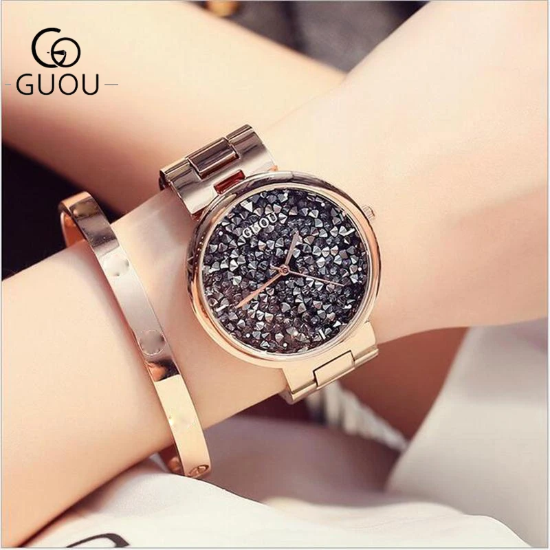 Beste Koop GUOU Horloge Top Luxe Exquisite Quartz Vrouwen Horloges Fashion Diamanten Stalen Armband vrouwen Watc Klok saat relogio feminino Goedkoop