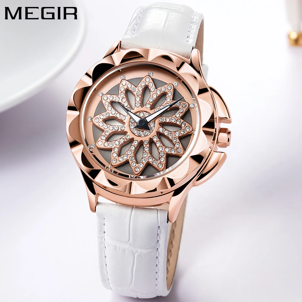 Beste Koop MEGIR Topmerk Luxe rose gouden dameshorloge wit lederen horloges voor vrouwen steentjes reloj diamantes mujer Goedkoop