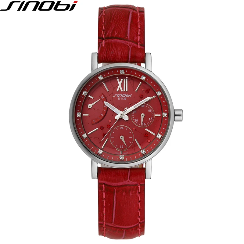 Goede Kopen SINOBI Wathes Vrouwen Rood Lederen Band Luxe Vrouwelijke Horloge Rattrapante Outdoor Datum Blauw Quartz Ladies Horloge 1136 Goedkoop