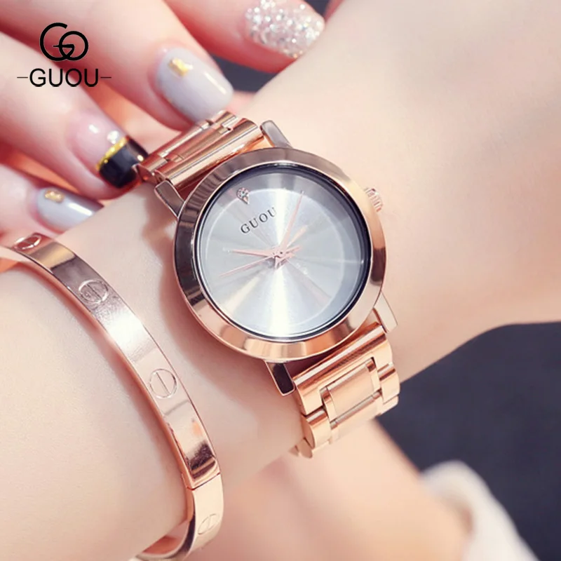 Goede Kopen Nieuwe GUOU Crystal Rose Goud Staal Vrouwen Dames Quartz Horloges Polshorloge Waterdichte Hardlex Gezicht 8171 Goedkoop