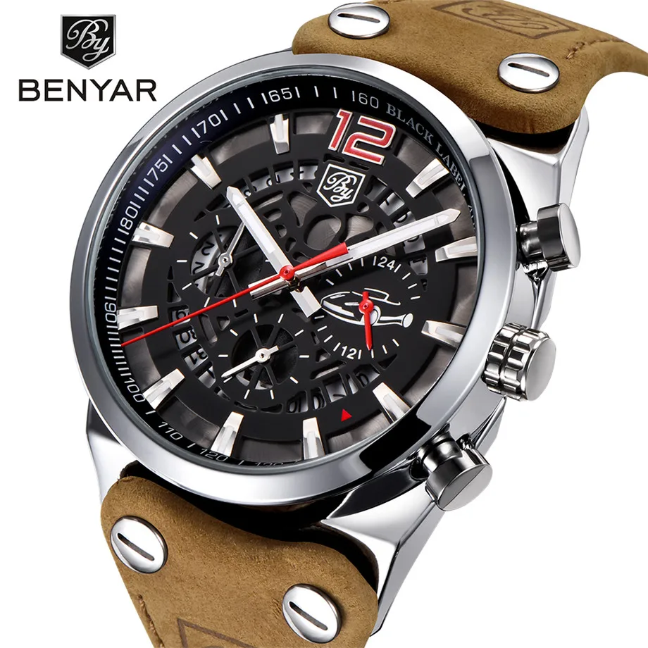 Beste Kopen BENYAR Mens Skeleton Horloge Militaire 3ATM Waterdicht Chronograaf Sport Tactische Man Horloges Echt Lederen Band Jurk Mannelijke Klok Goedkoop