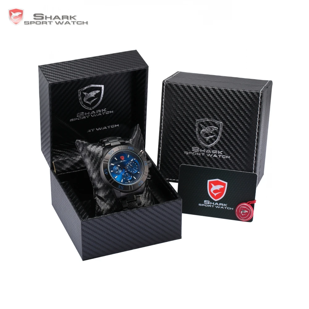 Beste Koop Luxe lederen geschenkdoos zandbank shark sport horloge 3 wijzerplaat chronograaf 24hr volledige zwarte stalen band quartz mannen horloge sh300 304 Goedkoop