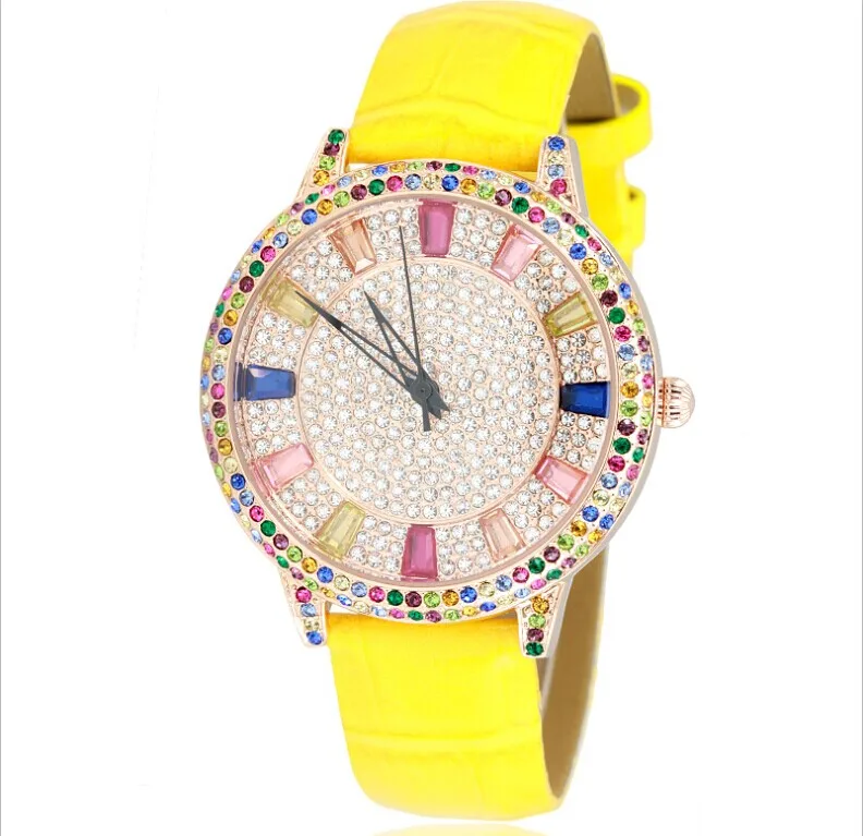 Kopen Goedkoop Mode Kleurrijke Steentjes Vrouwen Jurk Horloges Quartz Luxe Vol Kristallen Lederen polshorloge Quartz Relogio Montre femme Prijs