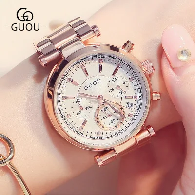 Kopen Goedkoop Hong Kong Merk GUOU Rose goud Mode Quartz Horloge Vrouwen Luxe Horloges Multifunctionele Volledige staal Horloges relogio feminino Online