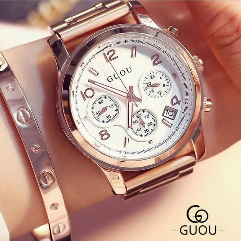Beste Koop GUOU Merk Horloge Vrouwen Horloges Luxe Rose Gold Dames Horloge Roestvrij Staal vrouwen Horloges Klok zegarek damski reloj mujer Goedkoop