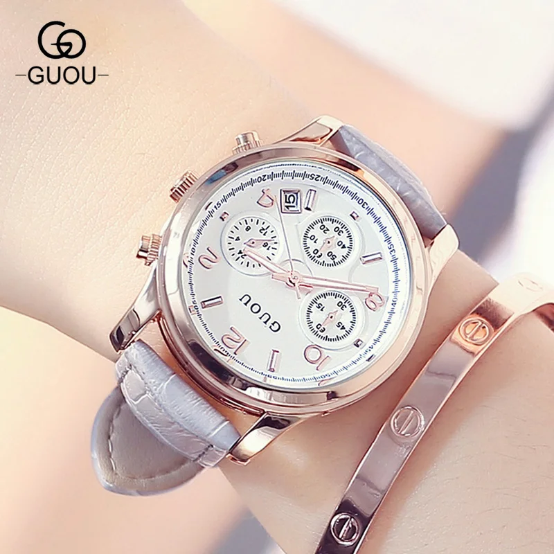 Kopen Goedkoop GUOU Fashion Vrouwen Jurk Quartz Horloge Casual Horloge Vrouwen Relogio Lederen 3 Ogen Kalender Horloge Klok Voor Dames Vrouwelijke Online