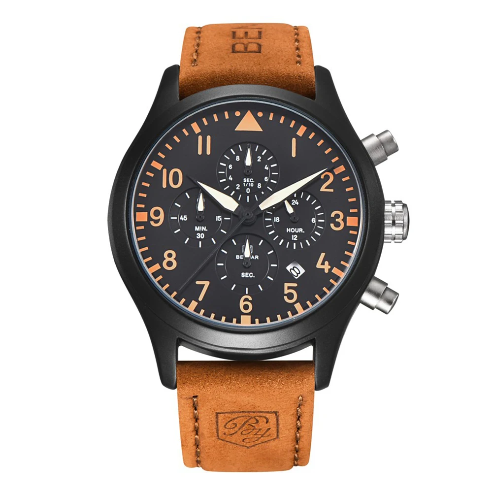 Beste Koop BENYAR Lederen Quartz Horloges Mannen Waterdichte 30 m Mode Sport Chronograaf Klok orange Goedkoop