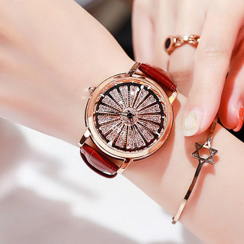 Beste Kopen Top Brand Rotatie Vrouwen Horloges Dame Luxe Hoge Kwaliteit Casual Quartz Horloge Vrouw Lederen Band Horloge Grote Dial reloj mujer Goedkoop