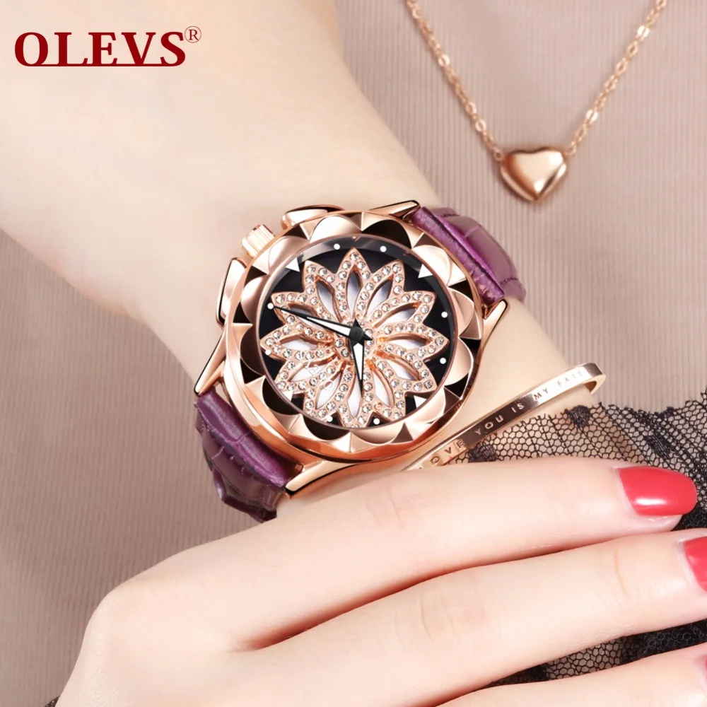 Kopen Goedkoop OLEVS Mode 360 draai dial Hoge kwaliteit Japan beweging Quartz Horloge Vrouwen Echt Lederen relogio feminino Strass Klok Prijs