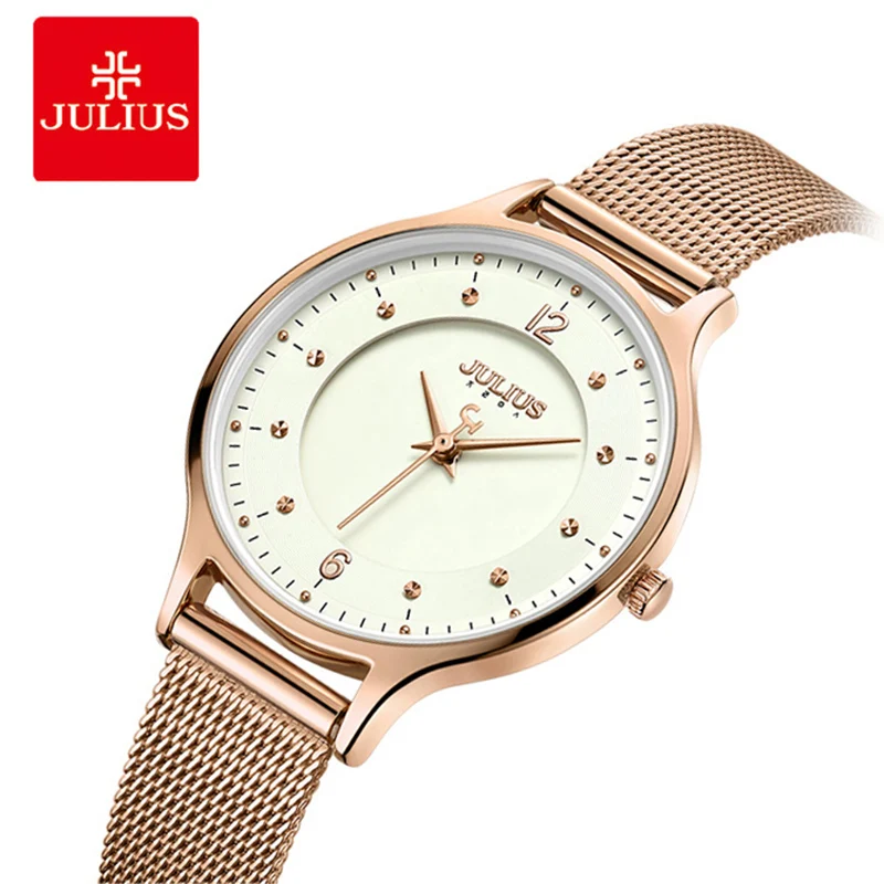 Goede Koop JULIUS Vrouwen Luxe Rose Goud Dunne Roestvrijstalen Gaas Riem Armband Horloges Dames Quartz Horloge Relogio Feminino Goedkoop