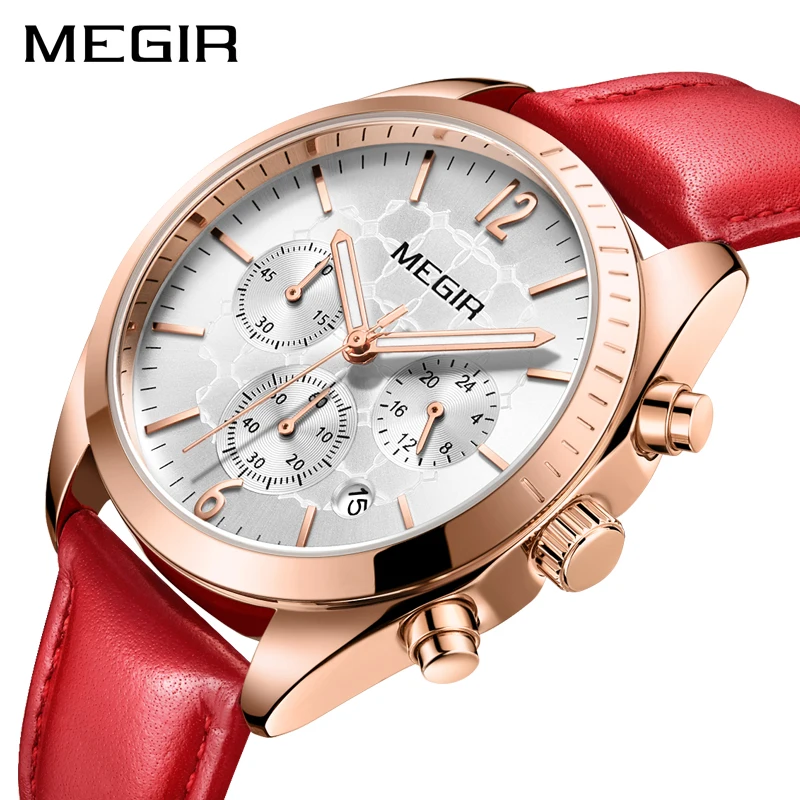 Beste Kopen MEGIR Merk Luxe Fashion Rose Gold Horloge Quartz Horloges Vrouwen Rood Lederen Band Horloge Dames Klok Vrouwen reloj mujer 2018 Goedkoop