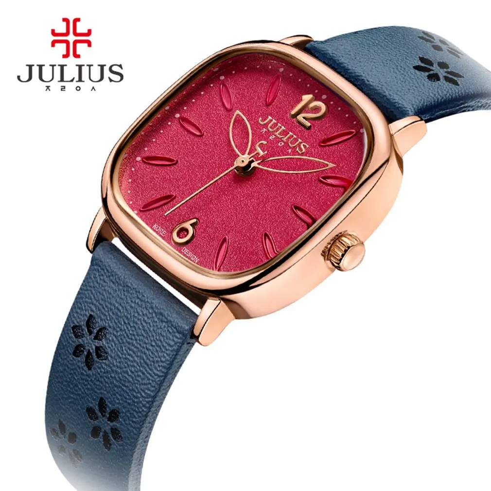Beste Koop JULIUS Vierkante Gezicht Rode Wijzerplaat Bloem Ontwerp Vrouwen Horloges Lederen Band Montre Femme Vintage Horloge voor Meisjes Goedkoop
