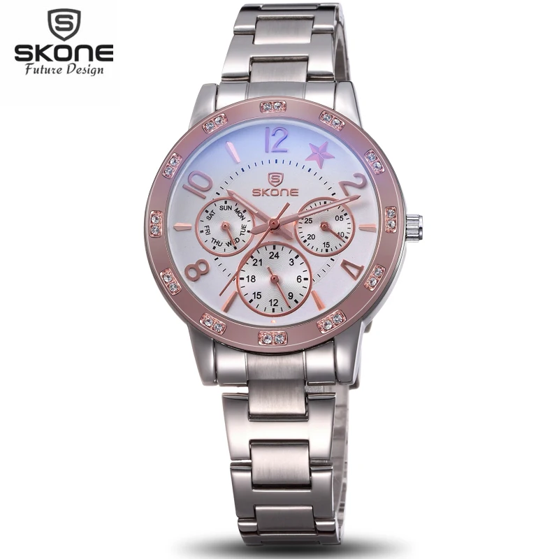Kopen Goedkoop SKONE Luminous Rhinestone Bezel Womens Chronograph Horloges Lady Fashion Zilveren Horloge Vrouwen Analoge Quartz horloge relogios feminino Prijs