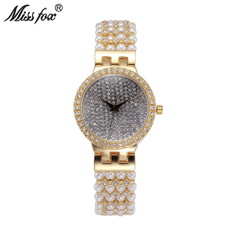 Kopen Goedkoop Miss Fox Beauriful Natuur Parel Horloge Vrouwen Rhinestone Gold Horloge Modemerk Waterdicht Schokbestendig Relogio Feminino Dourado Online