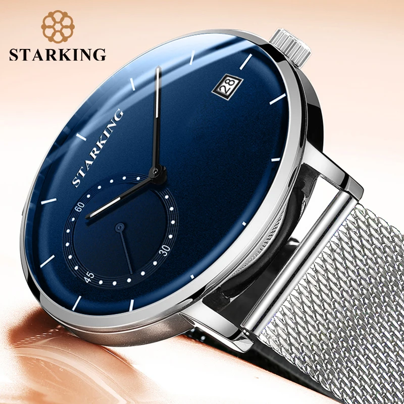 Kopen Goedkoop STARKING Dress Mannen Horloge Steel Mesh Band Quartz Analoog Horloge 3ATM Waterdichte Gebogen Glas Blauwe Mannelijke Klok Relogio Masculino Online